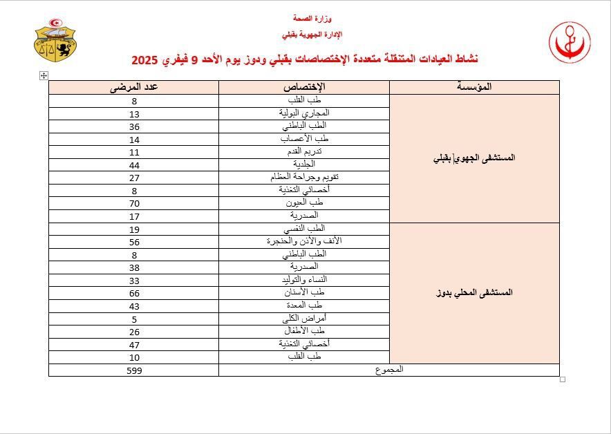 و تمت القافلة الصحية بكل من المستشفى الجهوي بقبلي والمستشفى المحلي بدوز تحت إشراف الإدارة الجهوية للصحة بقبلي و بالتعاون مع المندوبية الجهوية للمرأة و الأسرة و الطفولة و كبار السن، جمعية شفاء لكبار السن، جمعية مرضى السرطان بقبلي، جمعية فرحة للمكفوفين المسنين، جمعية ببت العز بقبلي و الهلال الأحمر التونسي فرع جوهرة سوسة