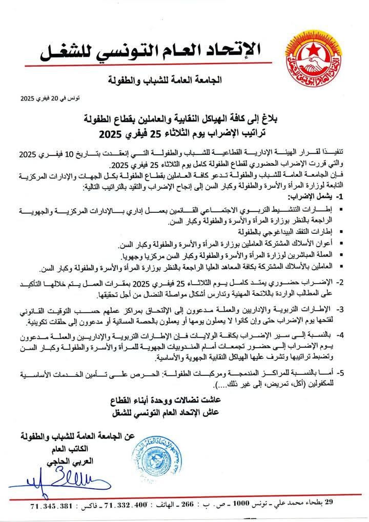 قررت الجامعة العامة للشباب والطفولة ضمن بلاغها الصادر يوم الخميس20 فيفري2025 بتنفيذ اضراب حضوري لقطاع الطفولة كامل يوم الثلاثاء 25فيفري وفق ماورد في نص البلاغ
