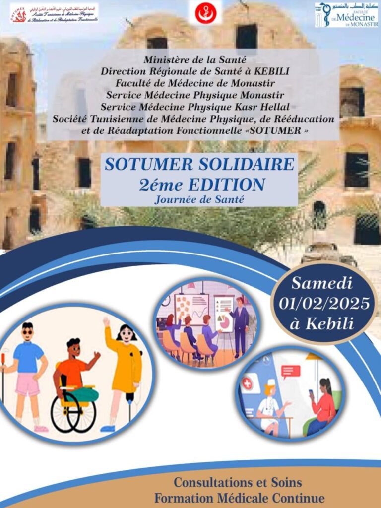 تحت اشراف وزارة الصحة والادارة الجهوية للصحة بقبلي ينظم المستشفى الجهوي بقبلي بالشراكة مع كلية الطب بالمنستير ،قسم العلاج الفيزيائي بالمنستير،قسم العلاج الفيزيائي بقصر هلال ، الجمعية التونسية للطب الفزيائي و التقويم و التأهيل الوظيفي SOTUMER ,عيادات طبية إختصاص الطب الفزيائي بالعيادات الخارجية بالمستشفى الجهوي بقبلي و ذلك يوم السبت غرة فيفري 2025