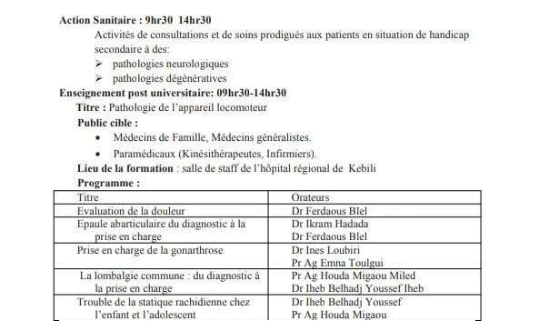 كما سيتم القيام بحصة تكوينية في إختصاص الطب الفزيائي لفائدة الفرق الصحية بقبلي حسب البرنامج المصاحب