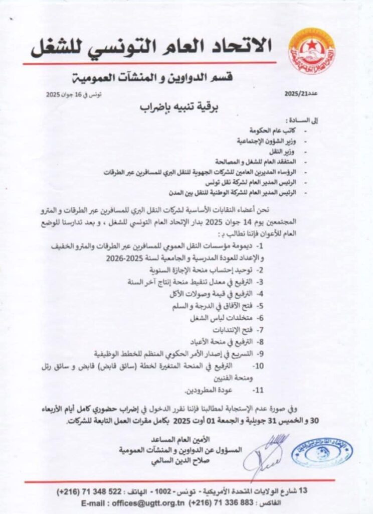 إثر اجتماع انعقد يوم الجمعة 14 جوان 2025 بدار الاتحاد العام التونسي للشغل، جمع النقابات الأساسية لشركات النقل البري للمسافرين عبر الطرقات والمترو الخفيف، عبّر المشاركون عن قلقهم الشديد من تدهور أوضاع مؤسسات النقل العمومي، داعين إلى ضرورة اتخاذ إجراءات عاجلة لضمان ديمومة هذا المرفق الحيوي