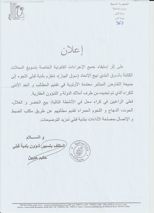 تعتزم بلدية قبلي تسويغ المحلات الكائنة بالسوق البلدي نهج الاتحاد (سوق البياز )كراء محلات للتجار الراغبين في الانشطة التالية بيع الخضر والغلال ,الحوت, الدجاج واللحوم الحمراء وفق ماجاء في الاعلان التالي