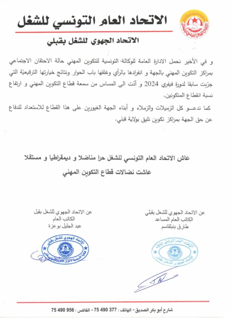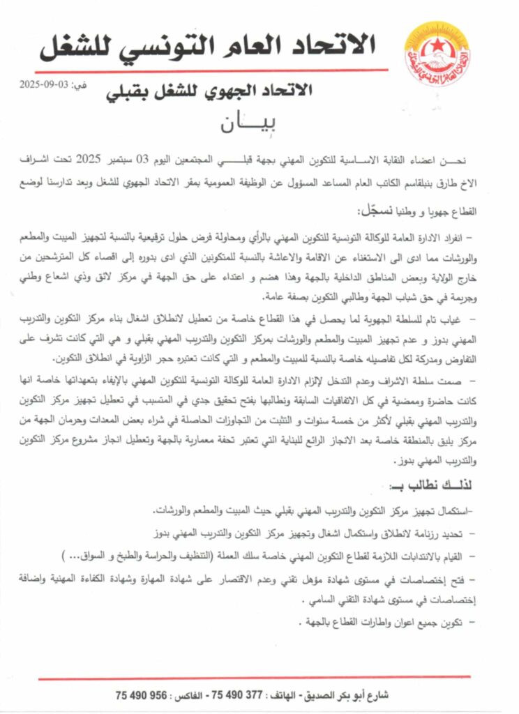 بيان نقابي بقبلي يُسلّط الضوء على قطاع التكوين في الجهة