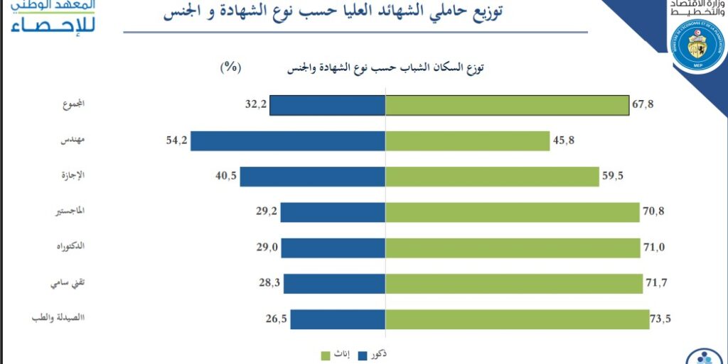 فحسب البيانات المتعلقة بتوزيع السكان وفق نوع الشهادة والجنس، تمثل الإناث قرابة ثلثي مجموع حاملي الشهادات العليا بنسبة 67.8%، مقابل 32.2% فقط للذكور، وهو ما يبرز الفجوة الكبيرة في التحصيل الأكاديمي لصالح المرأة في البلاد