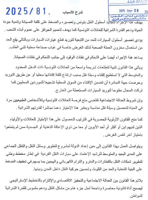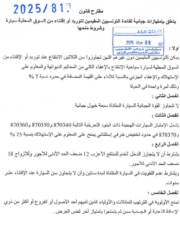 ويتعلق مقترح قانون عدد 081/ 2025، بامتيازات جبائية لفائدة التونسيين المقيمين لتوريد أو اقتناء من السوق المحلية سيارة وشروط منحها