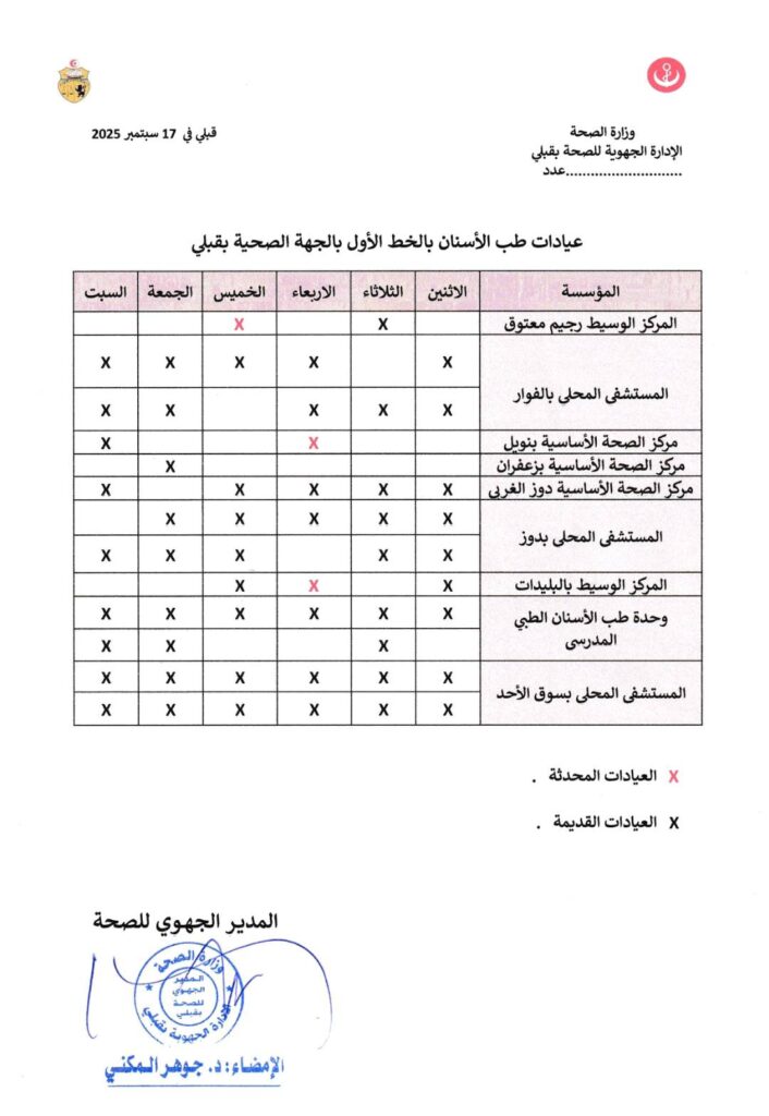 في إطار تنفيذ استراتيجية وزارة الصحة الرامية إلى تطوير وتقريب الخدمات الصحية من المناطق الداخلية، وتعزيز مبدأ المساواة في الرعاية الصحية ودعم الخط الأول، تم الترفيع في عدد عيادات طب الأسنان بالخط الأول من خلال إحداث عيادات جديدة بكل من: المركز الوسيط برجيم معتوق، مركز الصحة الأساسية بنويل، والمركز الوسيط بالبليدات، وذلك وفق الجدول التالي