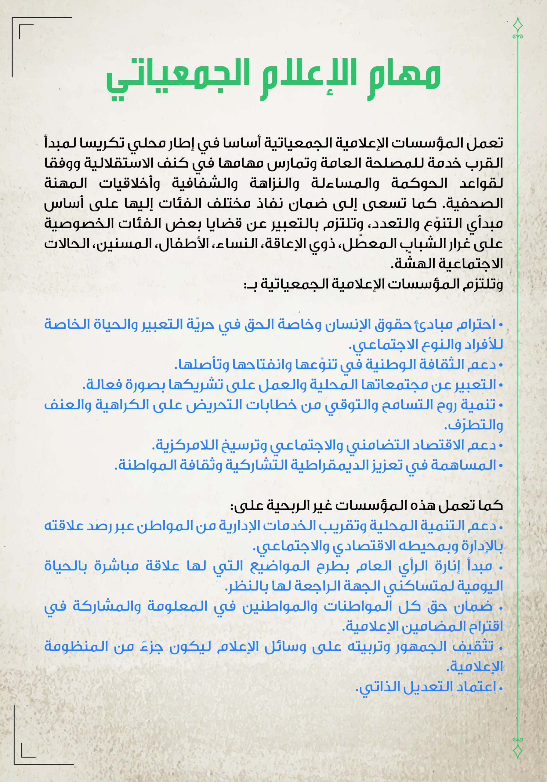 مواثيق وضوابط مواثيق وضوابط ميثاق أخلاقيات المؤسسة وثيقة مهام الإعلام الجمعياتي ميثاق شرف الإذاعات الجمعياتية ميثاق جودة المضامين الاعلامية معايير الجودة الصحفية السياسة العامة لاستخدام أدوات الذكاء الاصطناعي في مؤسسة نفزاوة الدليل التحريري لإذاعة نفزاوة عملية معالجة المعلومات المنشورة والتحقق منها إجراء إدارة تدفق المحتوى الإخباري على الشبكات الاجتماعية كجزء من المنتج الصحفي ميثاق النشر على مواقع التواصل الاجتماعي لإذاعة نفزاوة دليل الكتابة لإذاعة نفزاوة