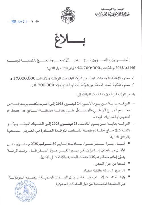 أعلنت وزارة الشؤون الدينية، في بلاغ لها اليوم الجمعة، بأن تسعيرة الحج بالنسبة الموسم 1446هـ / 2025 م حدّدت بـ 20.700،000 د وفق التفصيل التالي